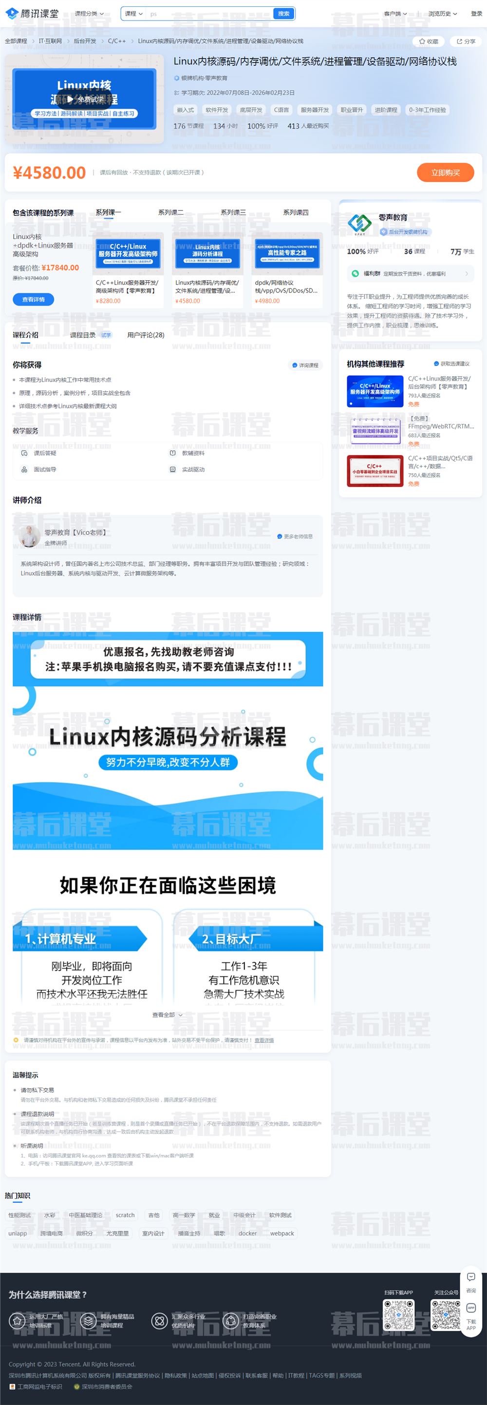课程特色:根据工作中,常用的内核底层技术点定制课程体系,1、五大技术专题2、 20个实战操作模块 3、2w+代码 。课程目标:3-5个月帮助学员掌握内核底层必备技术。课程服务:1、授课方式: 录播[即报即学,永久观看]。2、技术答疑: 讲师QQ 微信 、 电话随时一对一答疑 。3、班主任督学:及时反馈学员学习情况, 提高教学质量。4、面试辅导:针对学员情况 ,做简历指导,面试指导。课程适学人群:1Android\java 开发人群2 C/C++后台开发人群 3 Linux嵌入式开发人群4 Linux驱动开发人群 5 Linux内核开发人群 6 Linux虚拟化开发人群 7 研究Linux内核(兴趣爱好)人群 8 应用层开发想掌握底层原理人群。