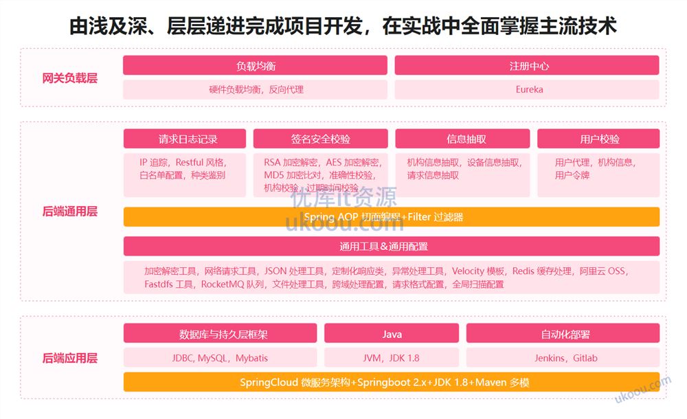 本课程由整理发布,通过全方位细致入微的讲解,围绕后端实战项目,基于SpringCloud微服务架构+Springboot+JDK+Maven等技术,让你全面掌握企业级Springboot 2.X主流技术,快速掌握企业级Springboot 2.X项目开发实战能力。